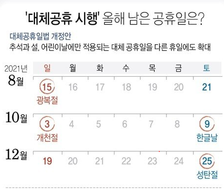 이슈 속보 대체공휴일 늘어난다···올 광복절부터 모든 공휴일에 적용 대체공휴일. 올해 남은 공휴일 중에 주말과 겹치는 공휴일이 4일이나 남아 있는 점도 강조했다.